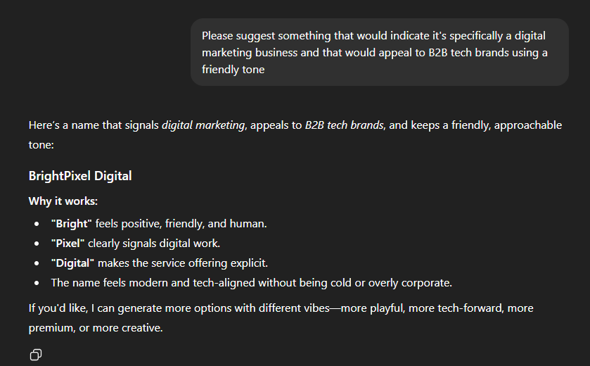 We typed “Please suggest something that would indicate it’s specifically a digital marketing business and that would appeal to B2B tech brands using a friendly tone” and got: