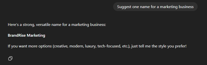 We typed “Suggest one name for a marketing business” into ChatGPT and got this response: